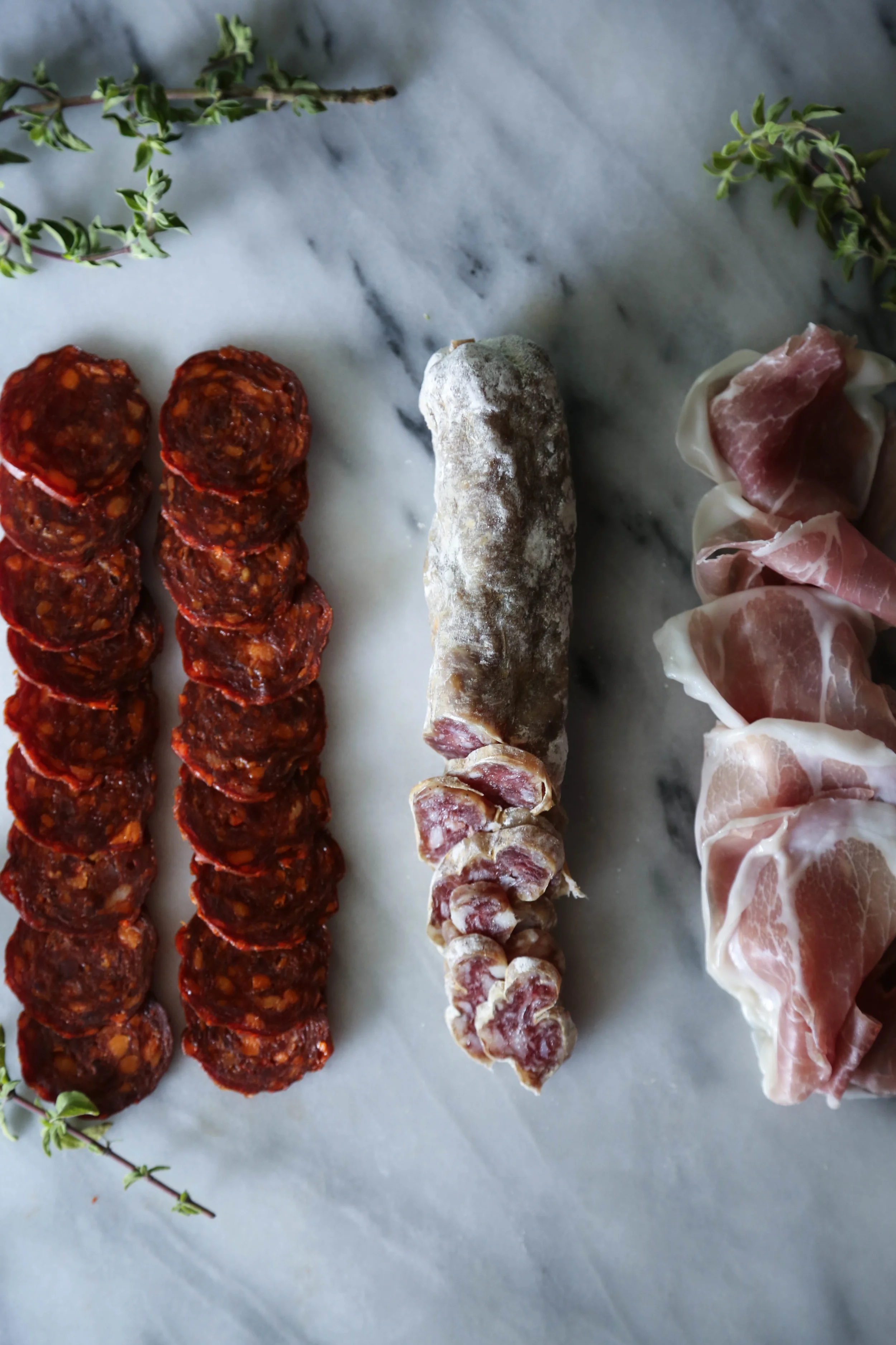 First, the meat. Since having any kind of spread is all about balancing textures and flavors, make sure you've got some variety. We usually start with picking out three meats of varying spice level and density. Some meats are spicier and harder than others, make your jokes but keep that in mind. To start with the mildest, choose a speck or Serrano ham, which will have a soft, melt in your mouth texture. Next, move on to something like a salami gentile, which will have a touch of spice, and a nice mid-range chewiness. Finally, move on to a chorizo or spiced salami, the hardest and spiciest of them all.