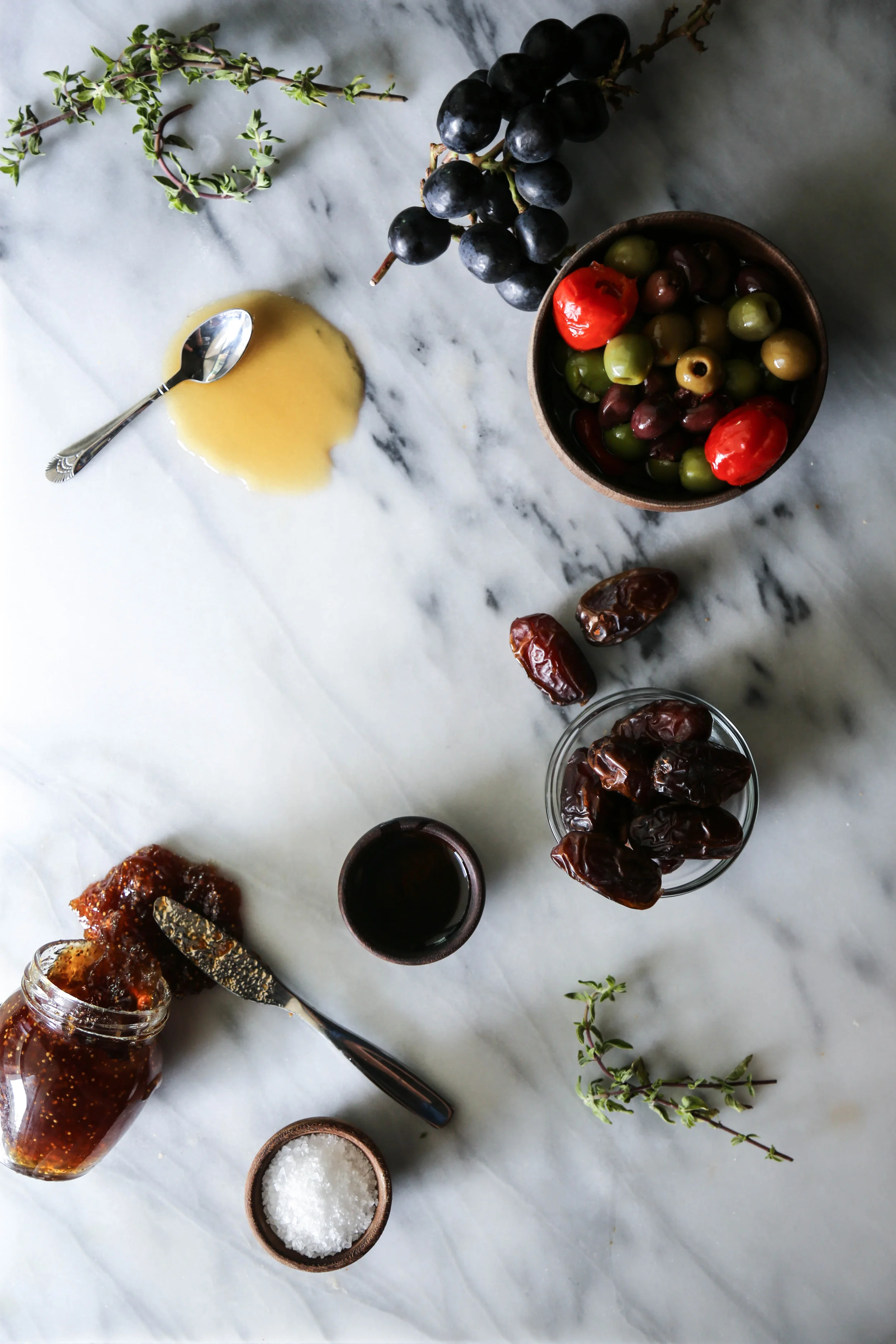 Now you've got to add some accouterments or whatever, which can be basically anything you want, though we've got some recommendations for you. Usually, we have at least one fruit (grapes, or our friend Cameron), one spread (Whole Foods sells this incredibly dope fig spread that will make you squeal), and some savory goodies like mixed olives or cheese twists. Also include some honey, olive oil, salt, and red pepper flakes for variety. As far as bread goes, typically a baguette and some crackers will do the trick, though you can get fancy with focaccia or brioche.