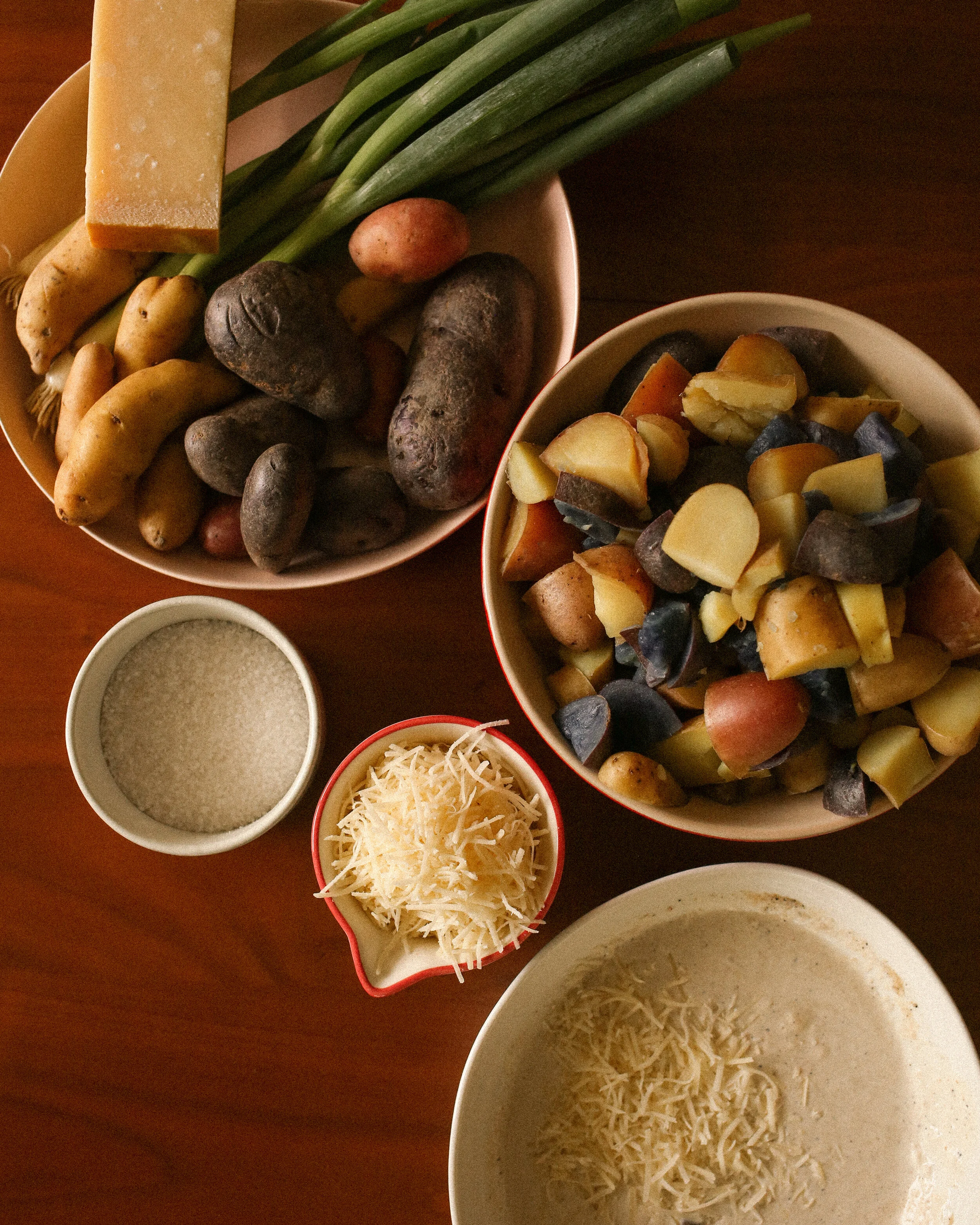 Make the dressing by whisking together the sour cream, mayo, horseradish, Parmesan, salt and pepper. Add the potatoes and green onions and gently toss to combine.