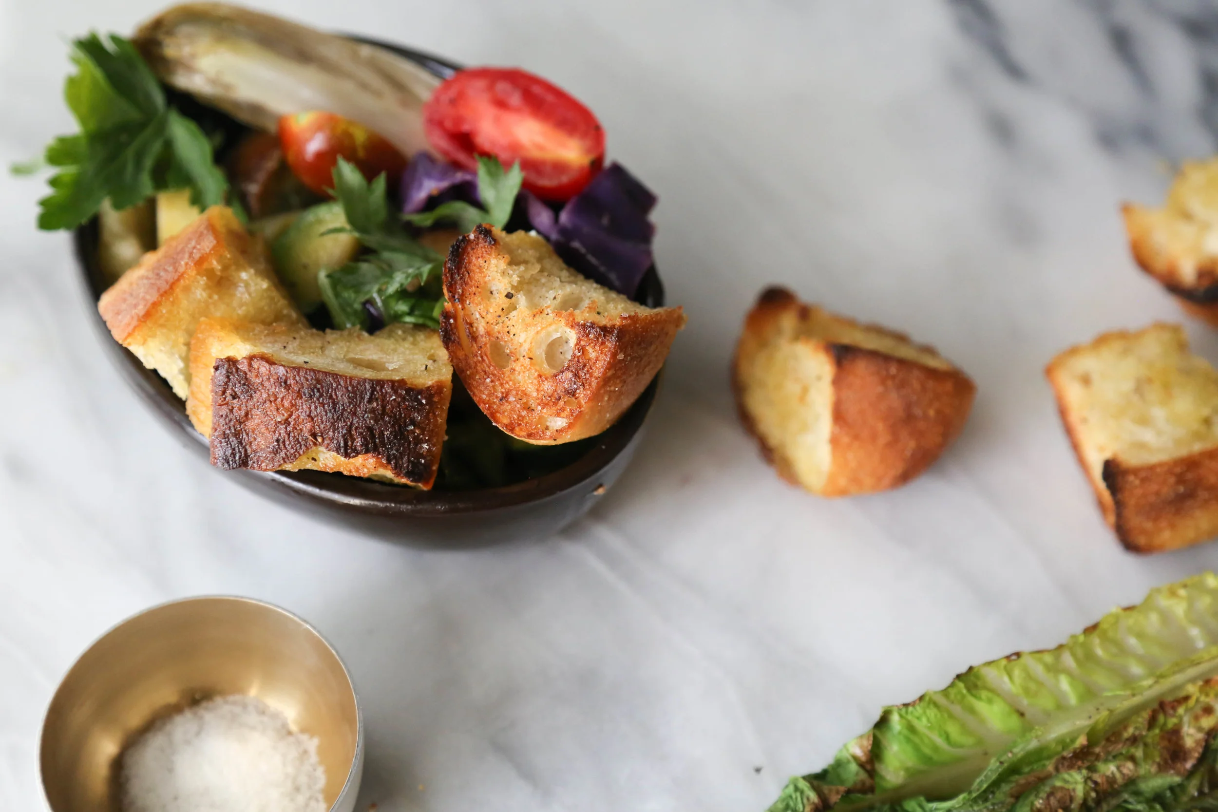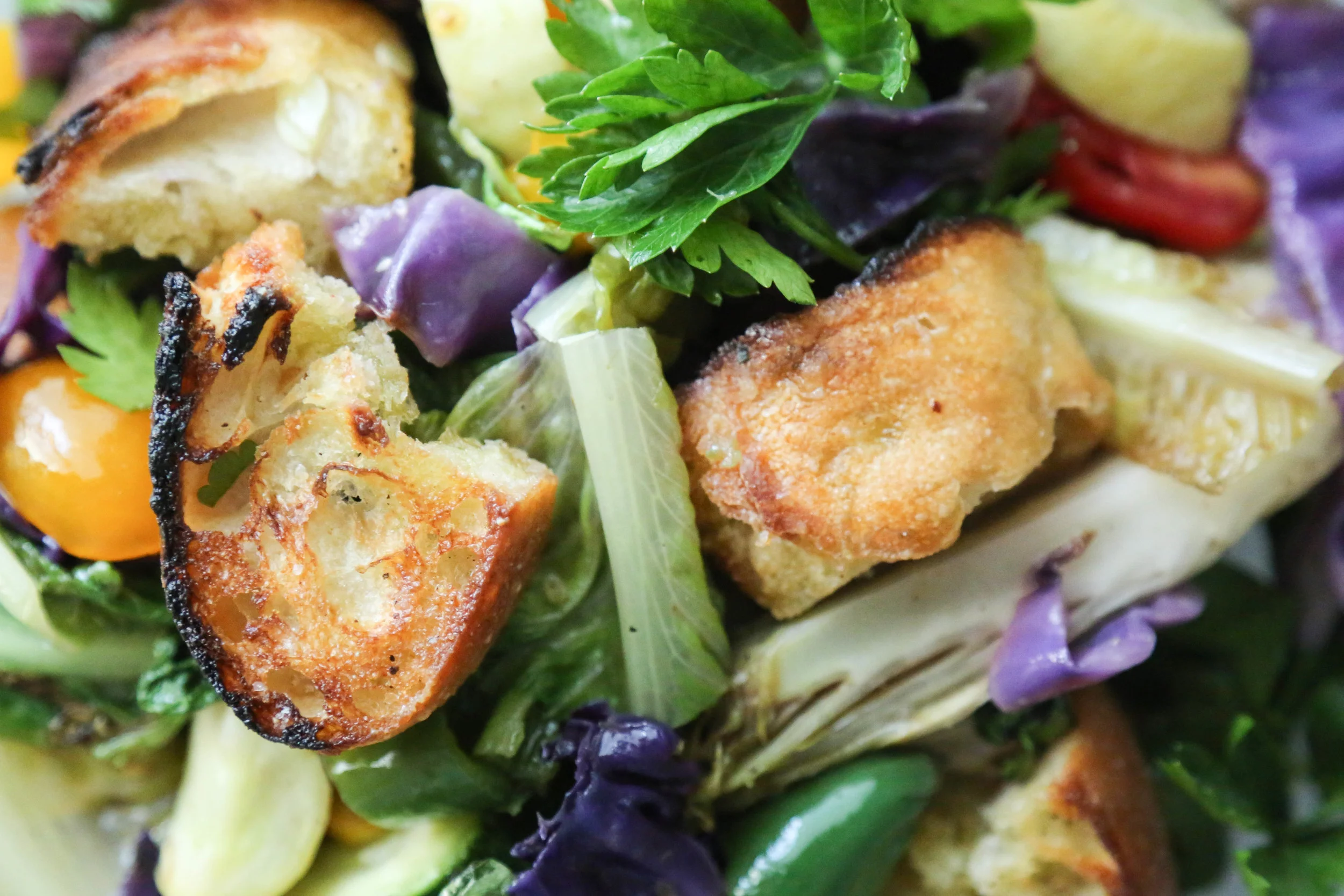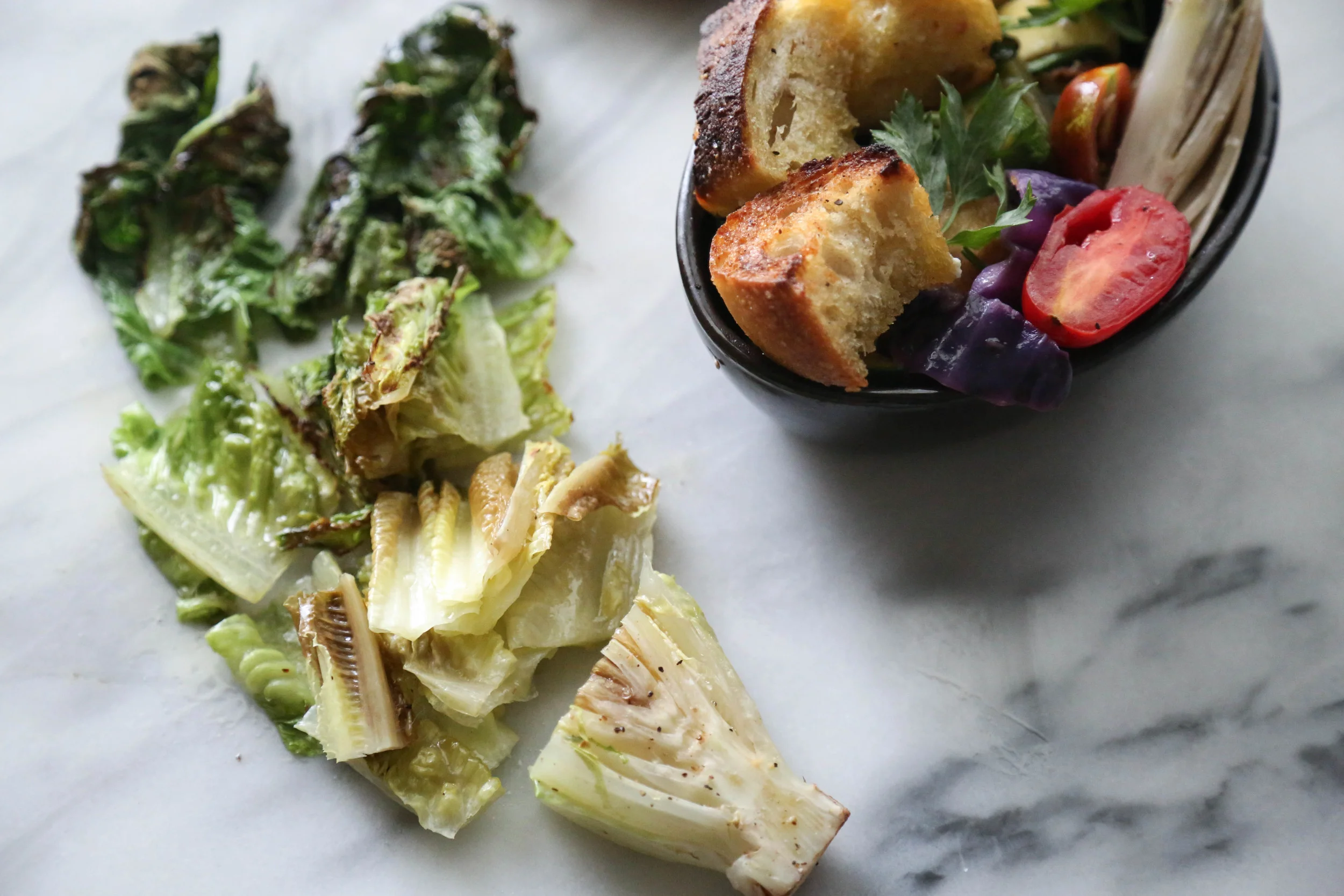 So, anyhow, I made a bread salad! It's kind of a twist on Panzanella, but instead of just bread and tomatoes, it's a whole bouquet of roasted summer vegetables and some roasted romaine lettuce leaves. I first heard of Panzanella from my #1 ride-or-die gal, Lily, over at Kale and Caramel who made a spring-time version with pickled radishes. I like this dish because it takes maybe twenty minutes to prepare and then you have a bowl of bread and roasted veggies, satisfying your need for carbs and nutrition all at once. Right before serving it, I threw gobs of burrata cheese on top, and you should too! Have a good hump day, loves!