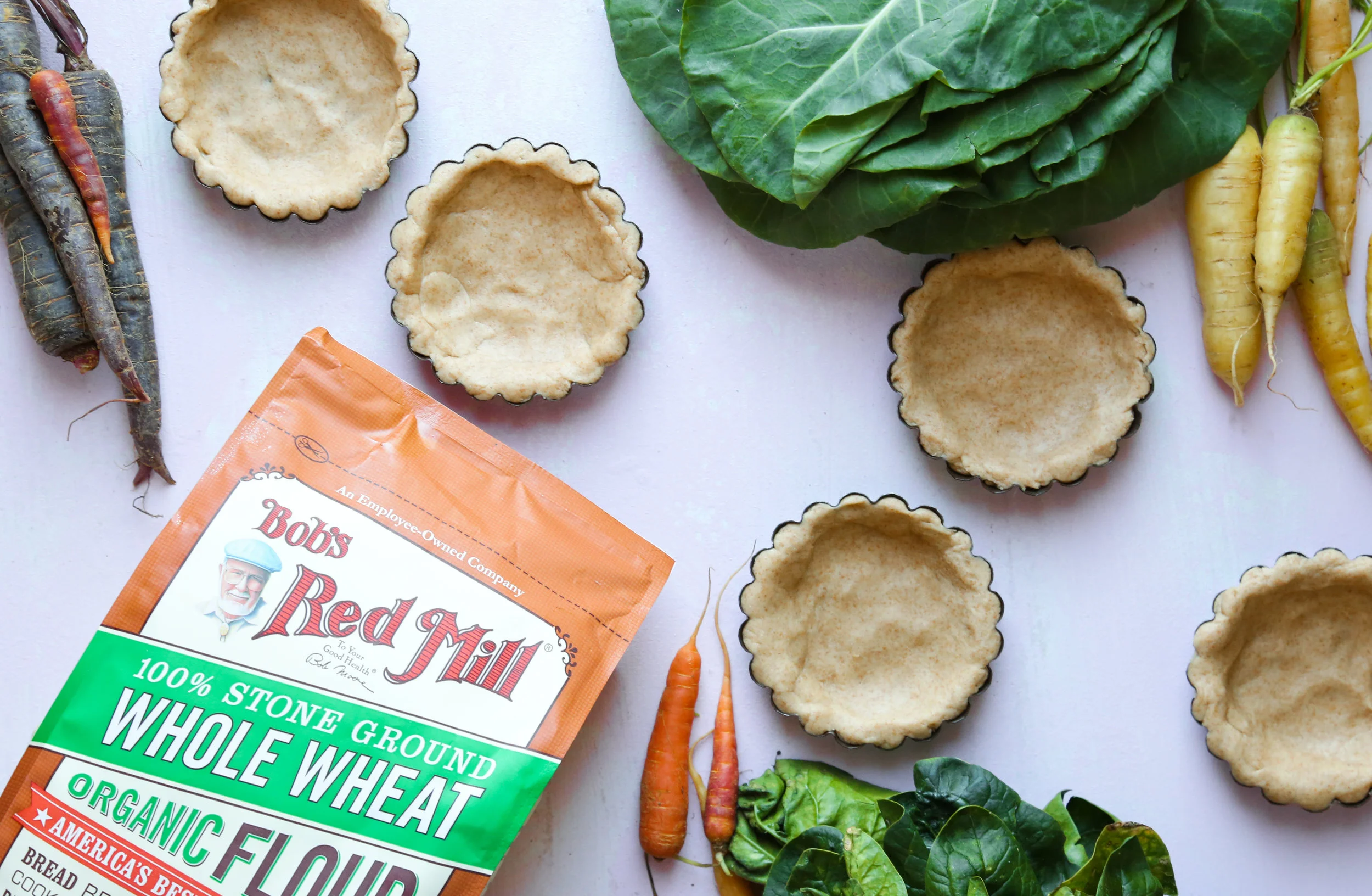 This particular quiche is made with a whole wheat crust and packed with some of the seasonal produce happening around New Orleans right now. For all you folks in the parts of the world that are still v frozen, feel free to get creative with some roasted cauliflower or potatoes. Oh and also feel free to add a lot of bacon. The crust itself is whole wheat because we love #health and it's an adaption from a recipe in one of our favorite books, The Art of French Pastry. Our favorite part of quiche is the crust, so this recipe has a bit thicker of a crust then most quiche, and the crust is a bit more dense - like a pie crust - to provide a sturdy base for the miniature quiches, meaning you can just pick em up and eat them with your hands! You can check out how we're throwing together this bad gal below!