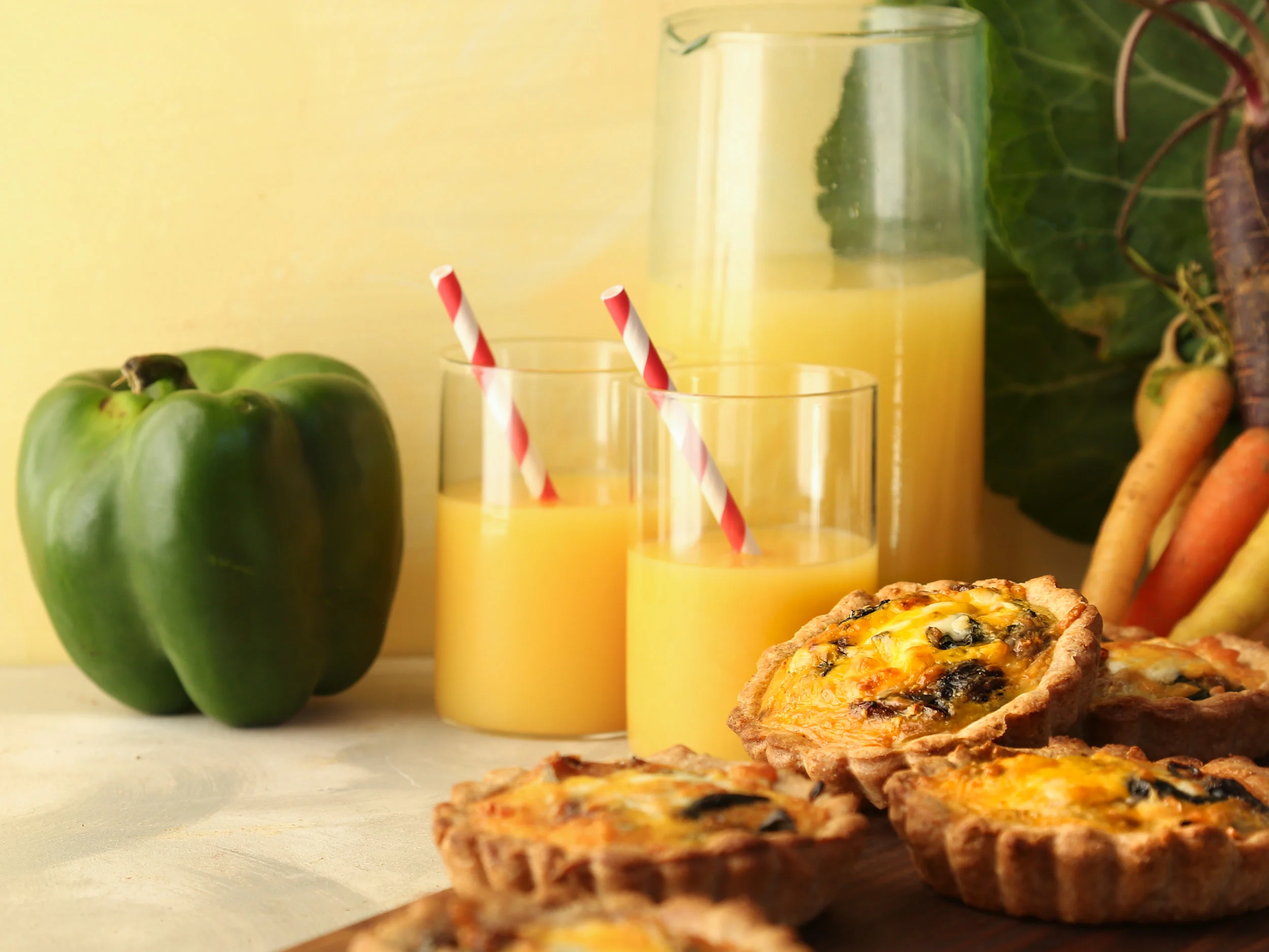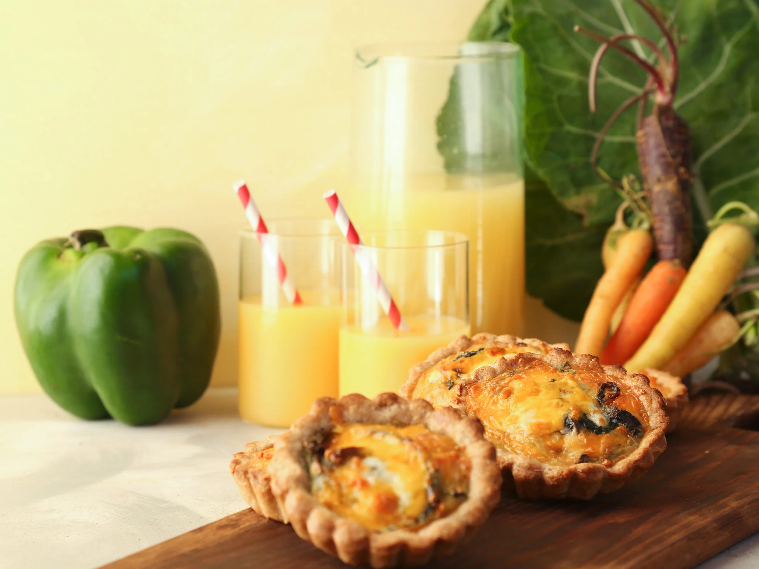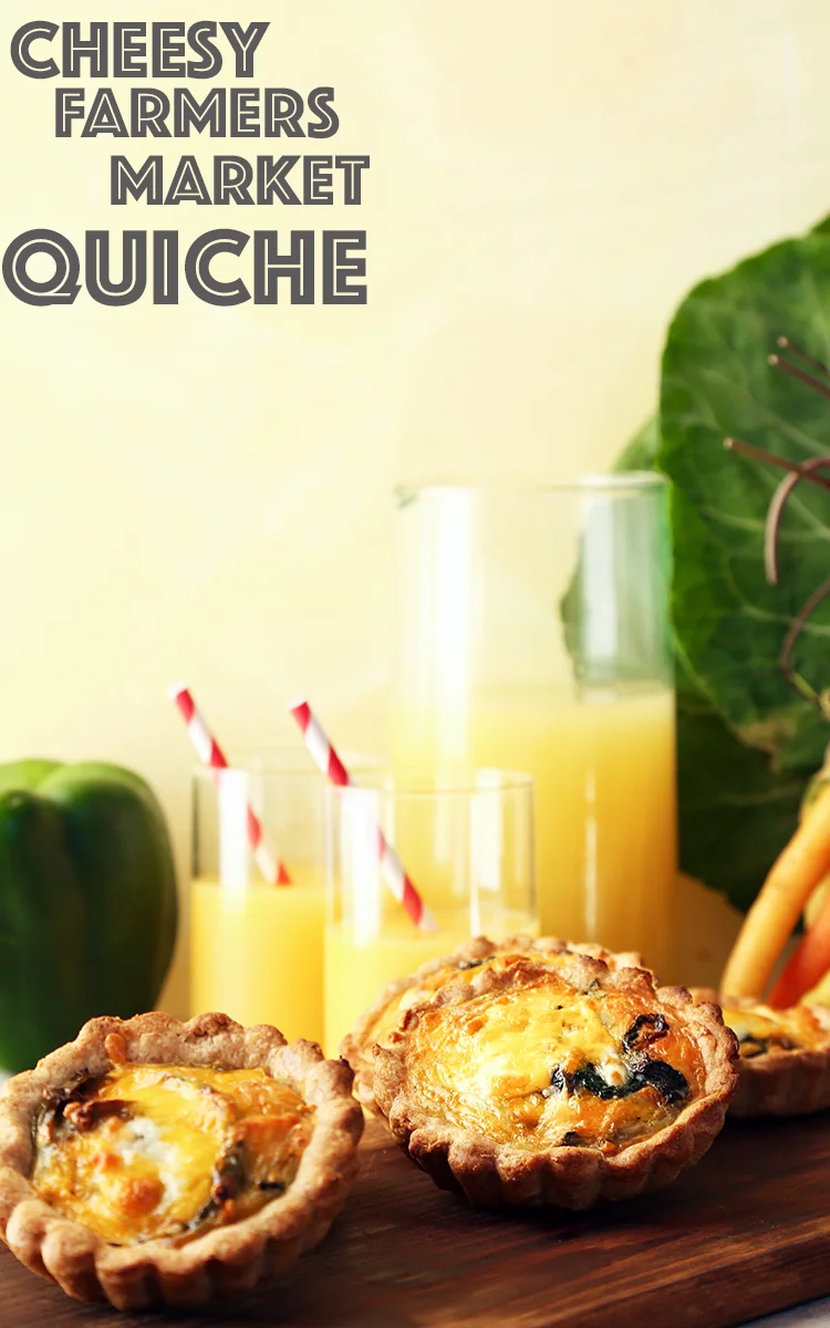 - Use tongs to transfer the sautéed vegetables to the crust(s). Place them evenly to cover the entire base of your crust. Whisk together the egg and cheese and pour evenly into the crust(s). Bake for 10 minutes (or 15 - 18 minutes for large quiche) or until the egg has set. Let cool slightly before serving!