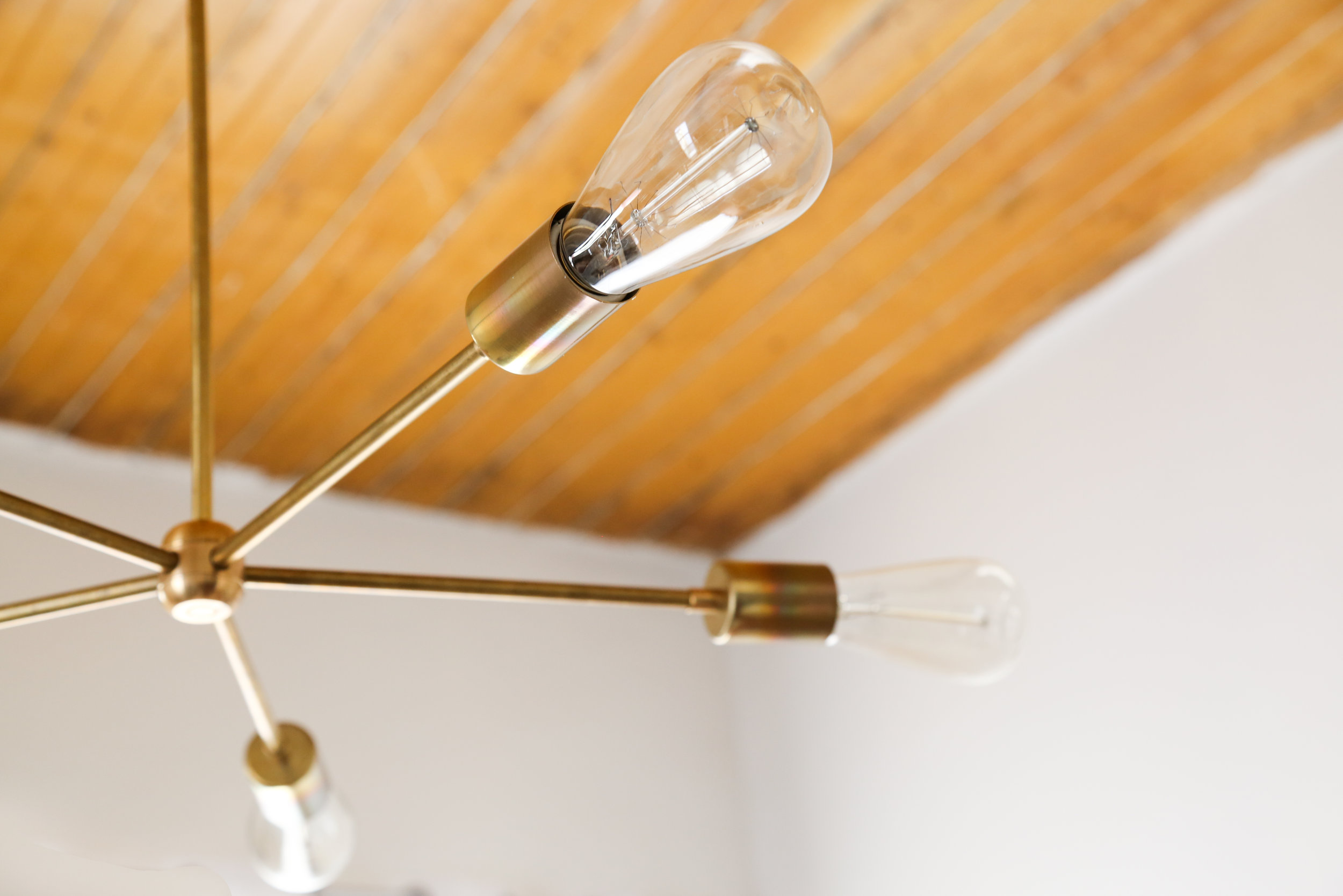 One of our local favorites is letting us giveaway something really really awesome! Kirsten of Sazerac Stitches builds hand crafted light fixtures in all kinds of shapes, sizes, and colors. Along with her husband, Matt, Kirsten has come up with amazing designs for sconces, chandeliers, and lamps and they are all intensely beautiful. The couple recently fitted our living room with this awesome 5-prong chandelier, and now they're letting us give away one to you guys! It's super easy to install (took maybe 5 minutes) and really did the trick of turning our only kinda decent living room into something really cute. We love it outfitted with the Edison bulbs, which emit a beautiful warm glow at night time.