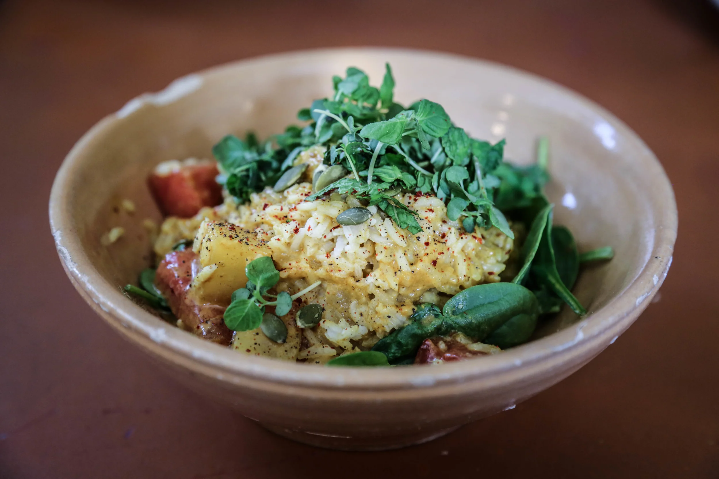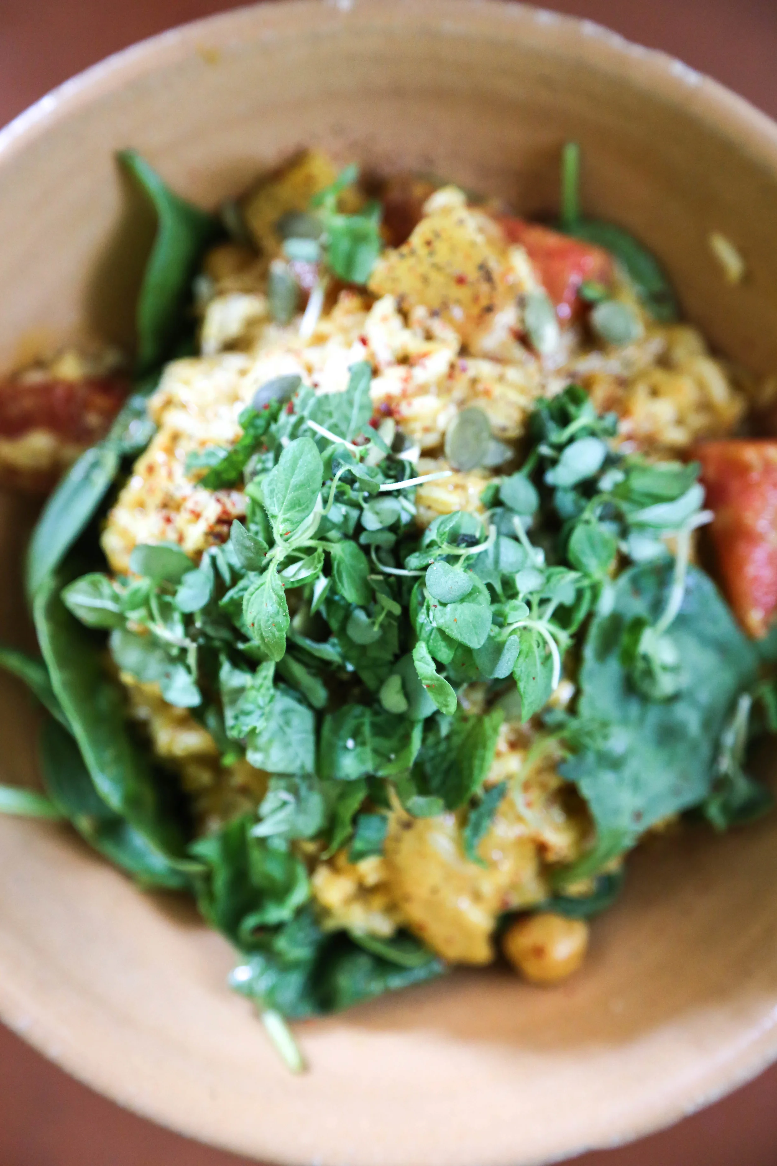 Bowl of Food // This is a signature dish that is a bowl (go figure) of seasonal grains, veggies (sometimes sweet potato fries - holy shit), and greens. Today it was a curried coconut milk rice thingy with watermelon, leafy greens, and herbs. We were kind of iffy on having warm watermelon in a dish but it honestly made us go "mmmmMMmm."