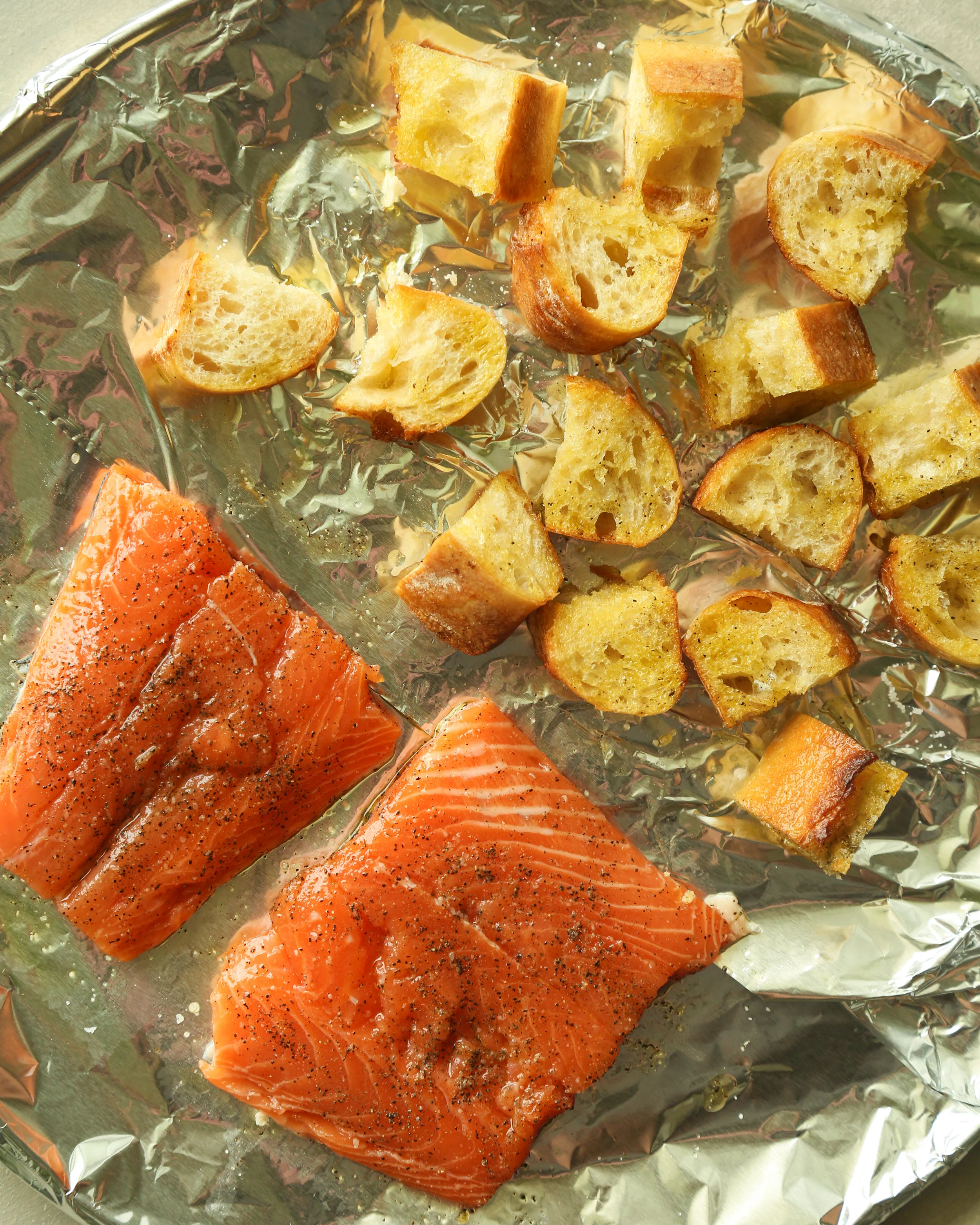 Preheat your oven to 375 degrees and line a baking sheet with aluminum foil. Add the baguette cubes to a mixing bowl and toss with 1/3 cup of olive oil and a pinch of salt and pepper. Transfer the baguette cubes (your soon to be croutons) to the prepared baking sheet in a single layer, making sure to leave room for the salmon. Reserve any leftover olive oil in the bowl from the croutons.