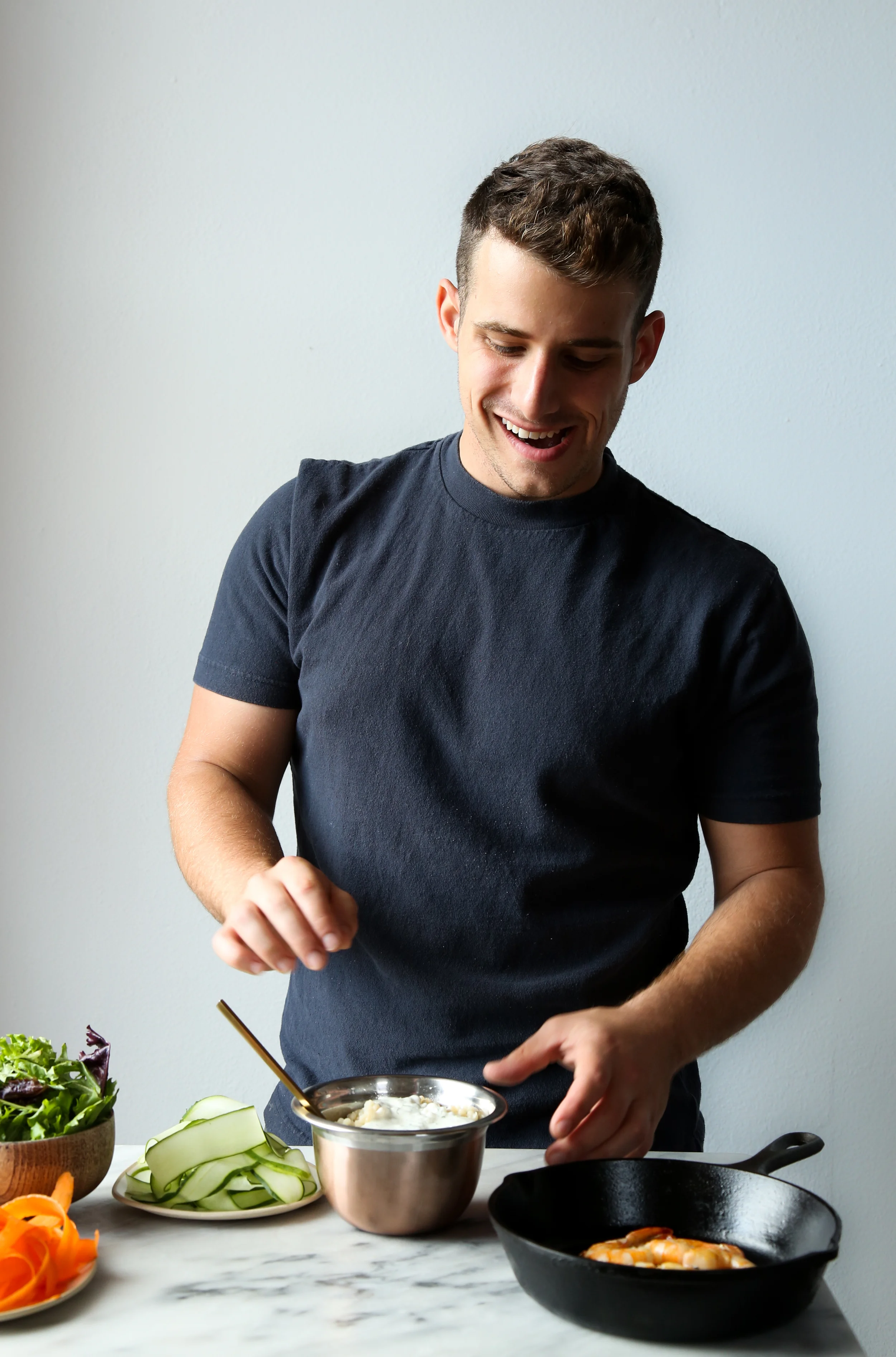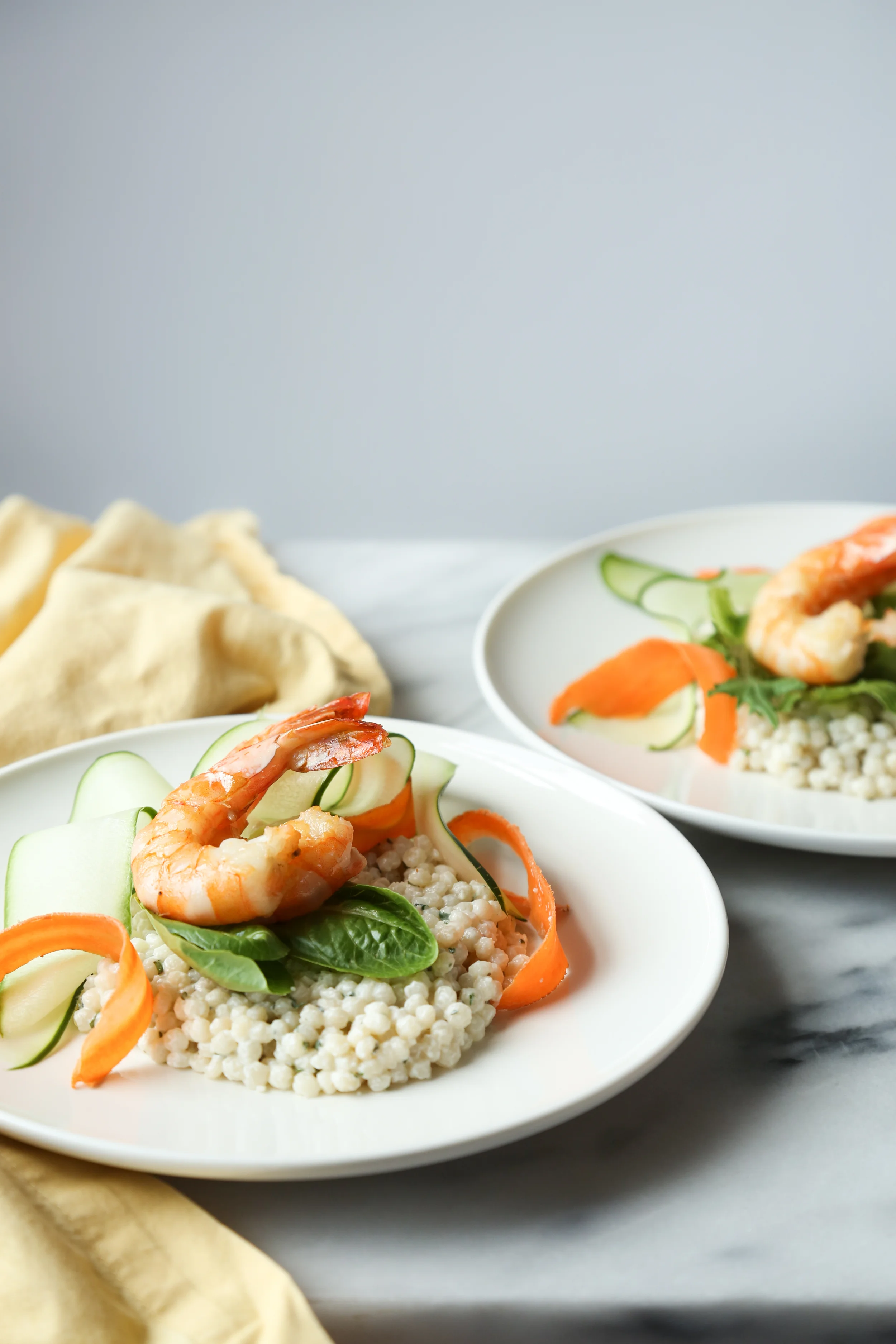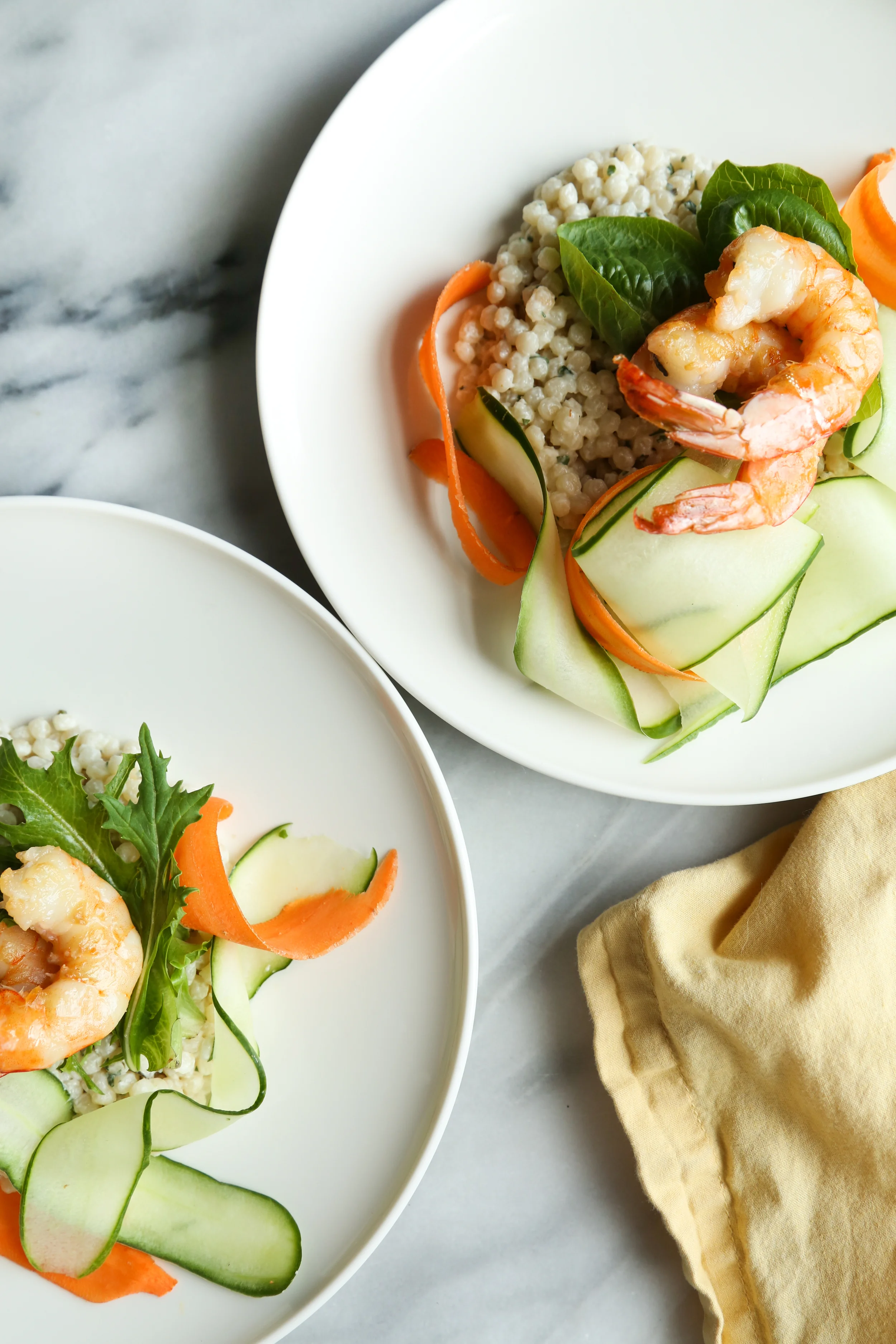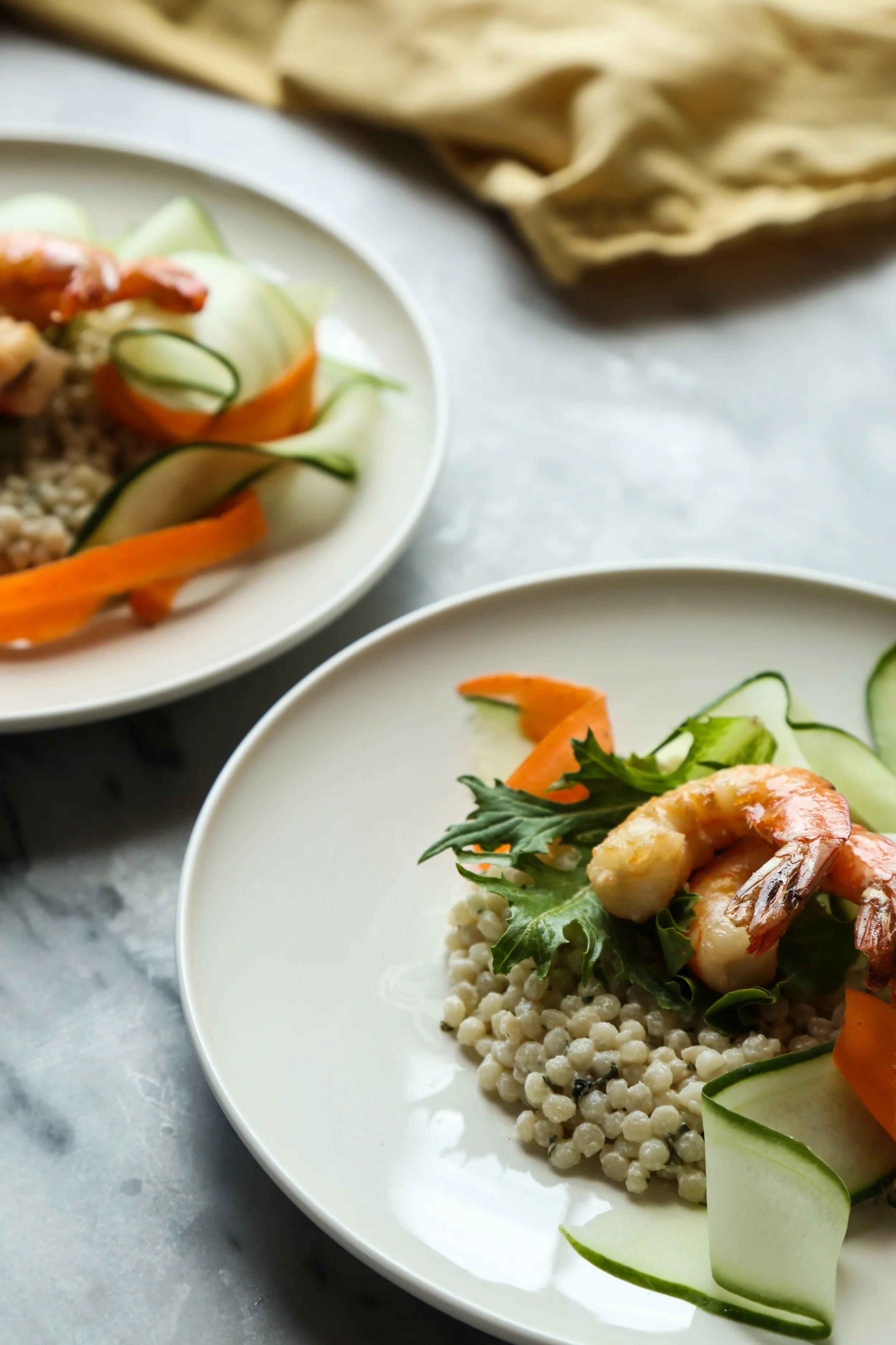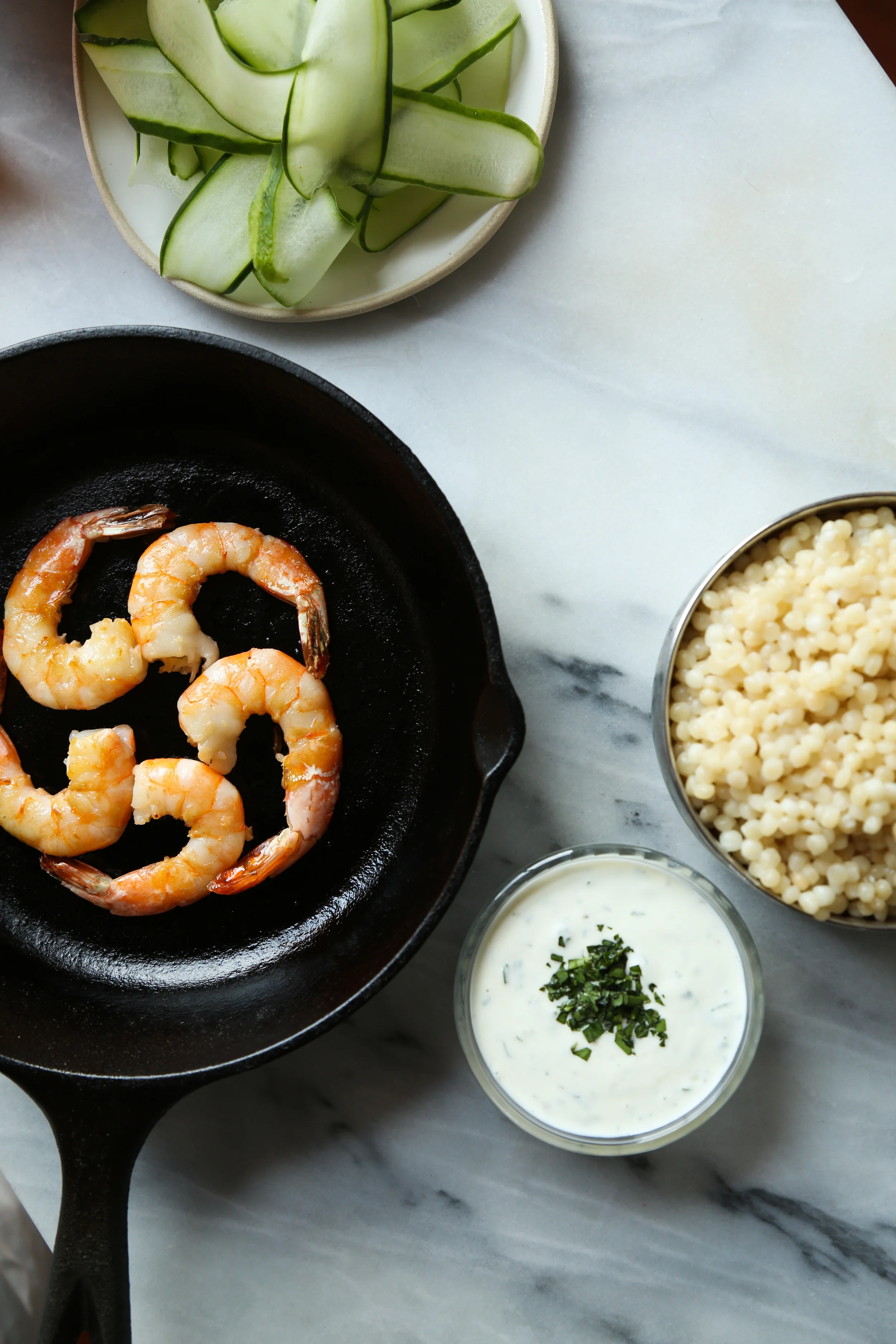 The inspiration for this deal comes from a combination of Matt saying "let's chop up a bunch of shrimp and shove it in a cucumber," and me saying "uh, no" and then us talking about a salad from one of our favorite restaurants in New Orleans, Meauxbar that had both shrimp and cucumber things. They basically take couscous and toss it in an awesome yogurt tarragon sauce and there are lots of herb stuff happening and also grilled shrimp and it's so good and so right and filling but also super light so you can eat like two or three of them, which is ideal. Making something similar to it felt like a good compromise between eating chopped shrimp in a cucumber and eating literally nothing. You can find the recipe below, sweeties!