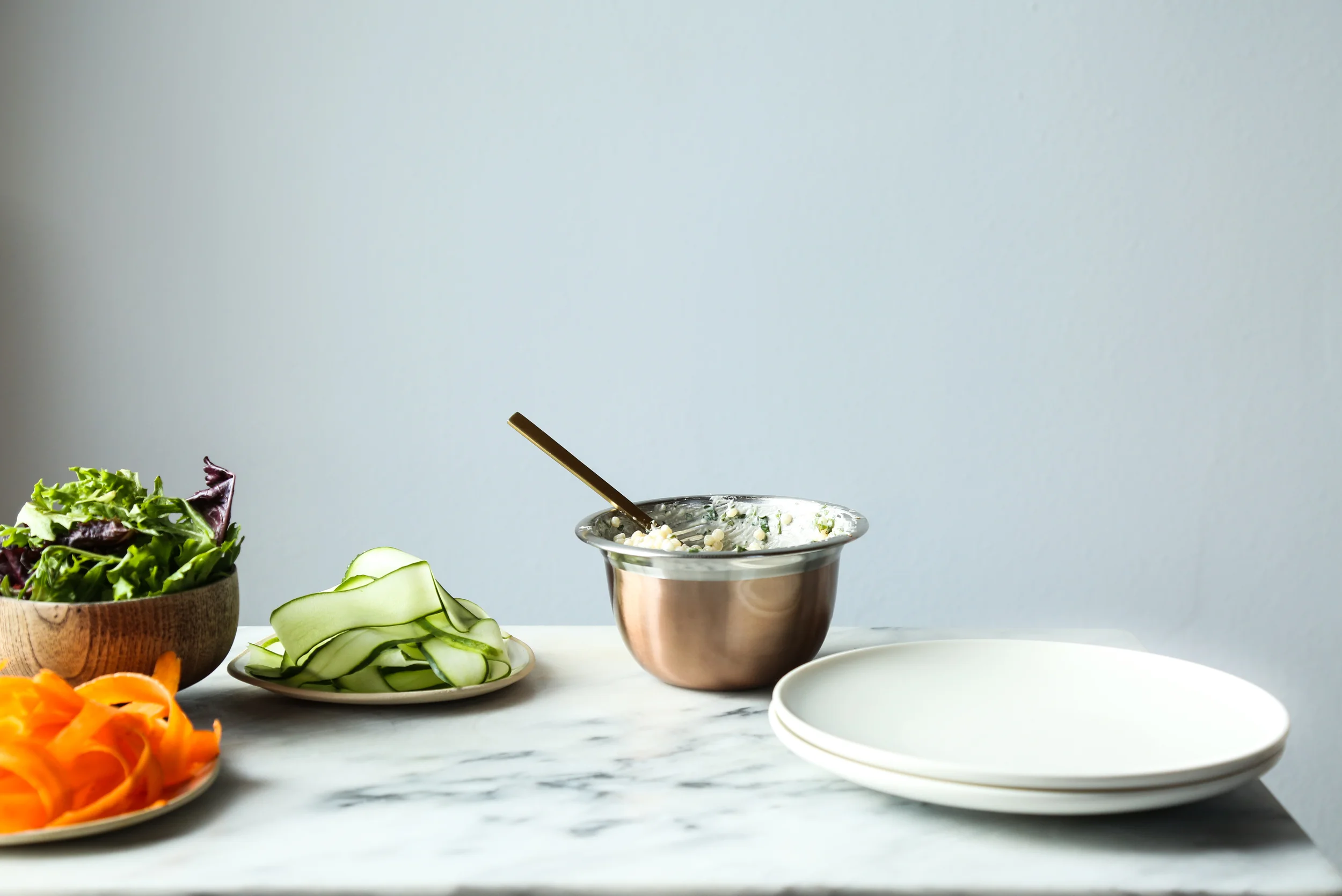 - Use a potato peeler to make the carrots and cucumbers into ribbons. Alternatively, you can cut them into match-sticks.