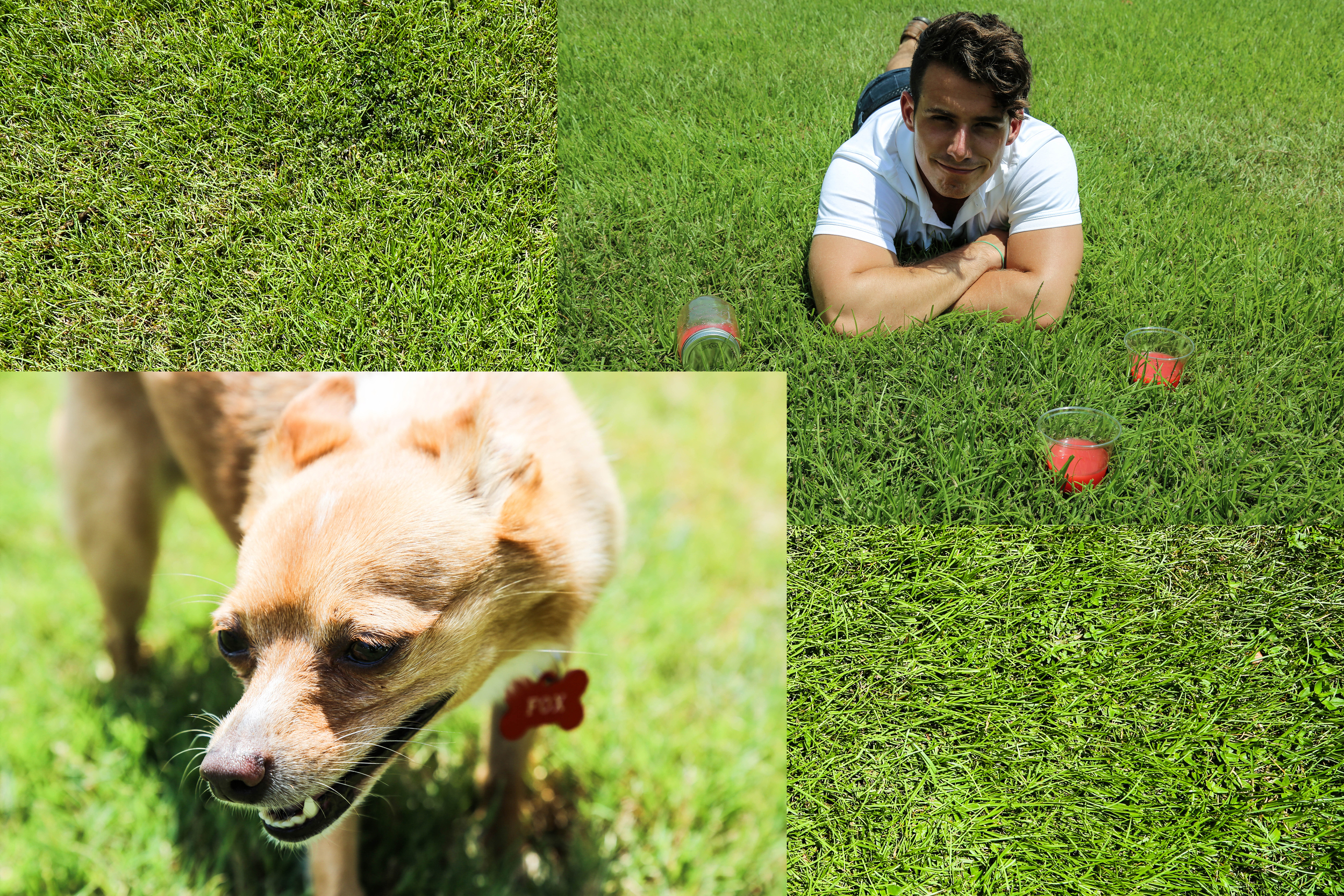 If you don't know, a classic negroni is made of equal parts London dry gin, sweet (red) vermouth, and Campari. I thought for this summery drink I might use some lighter, sweeter, more floral instances of those ingredients. For the gin, I've used Hayman's Old Tom Gin, old tom style gins having a lower prevalence of herbs and juniper and more citrus and white flower notes. I went with a white sweet vermouth, looking for this to bring more lightness in both color and flavor than the red variety. And instead of Campari, I opted for its sweeter, brunchier, easier cousin, Aperol. Cheers, y'all! Oh, and Fox is doing that thing I was talking about--"You're cool!/Scratch me!"